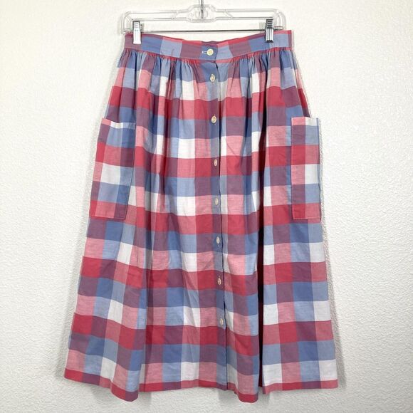 Vintage Russ Skirt Womens Medium Red Blue Plaid Cotton Button Front Pockets 80s