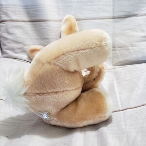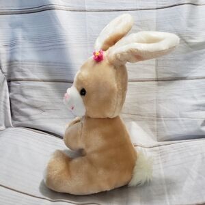 This vintage Russ plush stuffed animal is a must-have for any collector or fan of stuffed animals. The bunny rabbit design features a tan and white fur with a pink flower accent and pink nose, and is recommended for ages 3 and up. This particular toy measures 10 inches in size sitting, making it a small but charming addition to any collection.