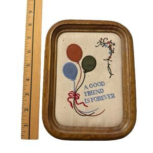 The Vintage Russ Traditional Treasures Oak Framed Needle Point Friendship Friend is a small framed applique print from the 1980s, featuring a folk art style with a country cottage theme. Made of wood and cloth, this piece depicts the subject of friendship and is framed for display. The cross stitch appliqué production technique adds to its handmade aesthetic, making it a unique and traditional addition to any art collection. This vintage piece is a timeless reminder of the value of friendship and a charming addition to any home decor.