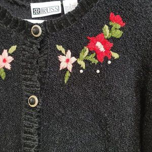 Vintage Women's Russ Sweater Cardigan Floral & Pearls Black Red Size Large.