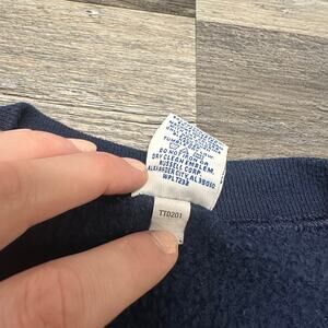 Pre-owned condition. Please note that the item has stains on the front sleeve navy blue colorway pullover fleece crew neck 50/50 cotton polyester made in Mexico vintage NCAA university collegiate sporty athleisure athletic team LPU Fiat Lux hoodie.