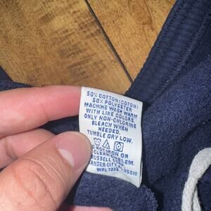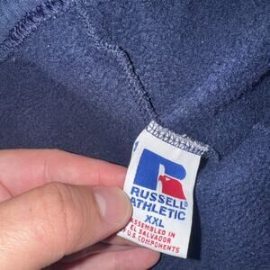 This product is a vintage pair of Russell Athletic sweatpants in navy blue, size XXL. They feature a drawstring closure and a classic style suitable for activewear. The distressed condition adds a unique and retro touch to the overall look. With a regular fit and comfortable 36x34 size, these sweatpants are perfect for men looking for a stylish and nostalgic addition to their activewear collection.