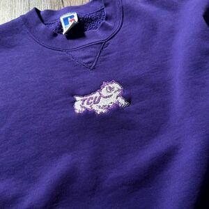 Russell Athletic, TCU, Horned Frogs, Sweatshirt, Crewneck, Vintage, College, Purple, Embroidered, Mascot, Large, Athletic, Made in USA, Team Apparel