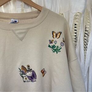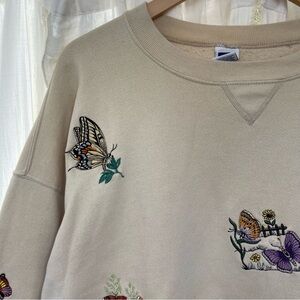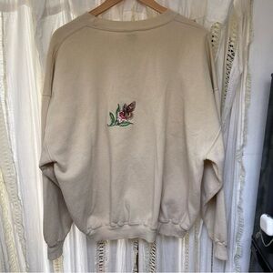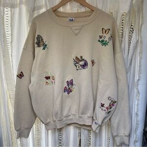Vintage Russell Embroidered Butterfly Garden Tan Cream Crewneck Sweater XXL