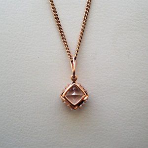 Gorgeous Vintage Original Russian Russia Soviet USSR solid 14K 585 Rose Pink Gold Genuine Faceted Russian Rock Crystal Pendant Necklace Chain about 9.1 grams (Pendant is marked "583 with star, hammer and sickle" and acid tested, Chain is marked on clasp "14K" and acid tested). Pendant is about 23mm in length (with bail), about 12mm in its widest and weighs about 2.7 grams. 14K Gold Necklace Chain is about 24" in length (with clasp), about 1.5mm in width and weighs about 6.4 grams. This unique Pendant Necklace Chain is in great vintage used pre-owned condition. (RGPBCNB)