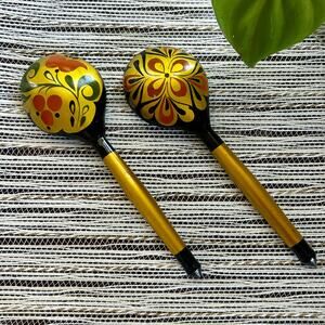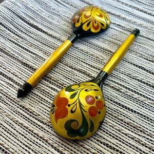 Vintage Russian Hand Painted Lacquer Wooden Spoons w/ Red & Gold Swirled Designs