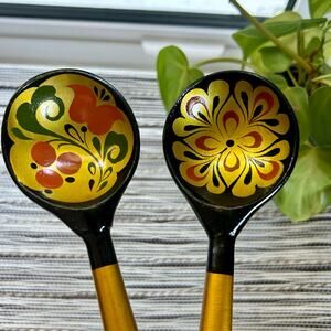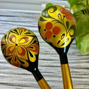 Vintage Russian Hand Painted Lacquer Wooden Spoons With Black Red and Gold Swirled Designs. Set of 2 In very nice vintage condition.