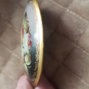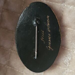 Beautiful black lacquerware on wood of hand painted roses in yellow orange blue green florals. Background is gray and black. Delicate gold gilt edge detail. Artist's signature on reverse. Vintage "traditional old school" all Hand Painted Russian Lacquer Brooch