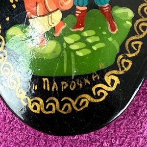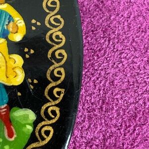 Vintage Russian Hand Painted Oval Brooch Lacquer Dancing Couple Signed Folk Art