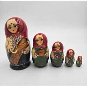 Vintage Russian Matryoshka Nesting Dolls 6-Piece Hand-Painted Floral Wooden Set
