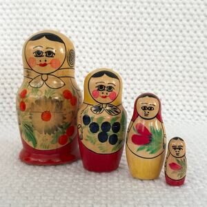 Set of 4 vintage Russian nesting dolls. Preowned in good condition with light signs of wear throughout. Unmarked.