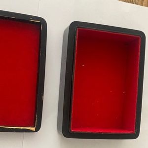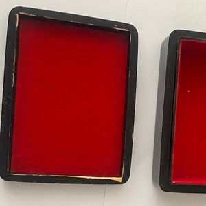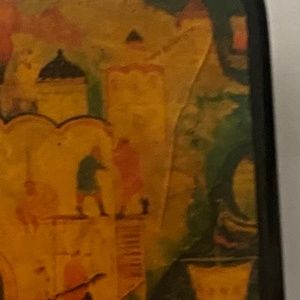 Purchased in Leningrad in 1990, this Palekh box is lined with velvet, and measures 4 1/2" wide, 6 1/4 long and is 2 1/4 deep with the lid on. NB: There is slight buckling of the papier mache in the upper right and left quadrants as shown in the blow-ups, but no signs of peeling.