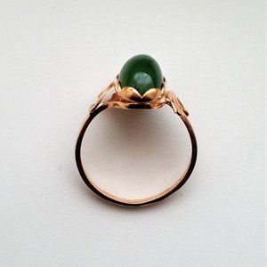 Gorgeous Vintage Original Russian Russia Soviet USSR solid 14K 583 Rose Pink Gold genuine Russian Green Nephrite Jade Cabochon Bypass Design RING about size 9.5 (marked "583 with star, hammer and sickle" and acid tested). Top of the ring is about 16mm by about 9mm (widest). Genuine Russian Nephrite Jade is about 15mm by 8mm (widest). This unique ring weighs about 4.1 grams and is in great vintageused pre-owned condition. (RGR)