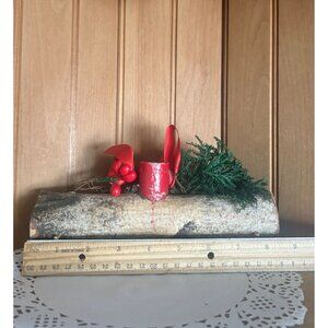 Vintage Rustic Birch Log Candle Holder Pinecone Red Ribbon & Berry Accents 12" Long Tabletop Holiday Decor 1950s