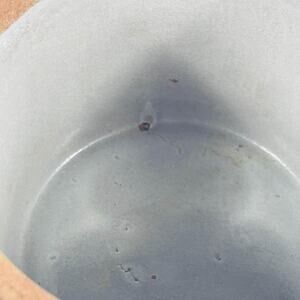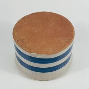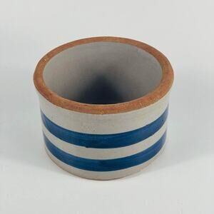 Vintage Rustic Butter Crock Blue Striped Small Stoneware Container. Chip on inside as shown. See pictures for condition. 3 x 4 5/8”
