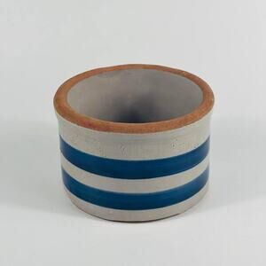 Vintage Rustic Butter Crock Blue Striped Small Stoneware Container