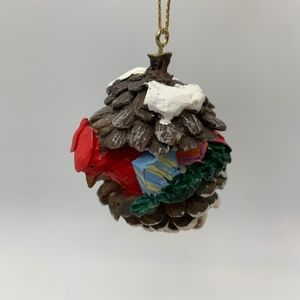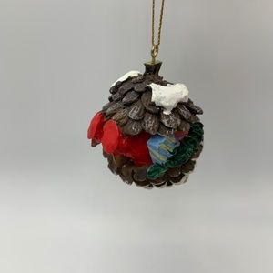 Vintage Rustic Ceramic Snowy Pinecone Birds & Presents Christmas Ornament