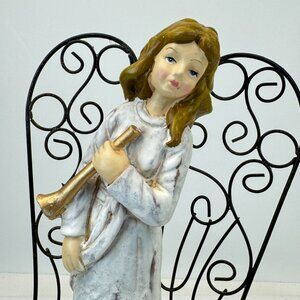 Vintage Rustic White Christmas Angel Figurine With Metal Wings Gold Trumpet 11"