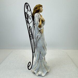 This rustic resin Christmas angel figurine features a gold trumpet horn and elegant metal wings, standing at 11.5 inches tall. Its hand-painted details and serene demeanor add charm to any setting, reflecting a sense of peace and musical inspiration. Ideal for those appreciating rustic decor and musical symbolism.