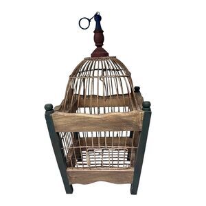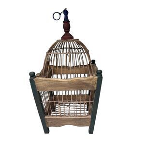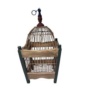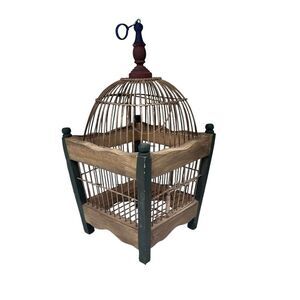 This Vintage Rustic Wood and Wire Decorative Bird House Bird Cage measures 14" x 7.5" and features a dome-style wire cage atop a tan and black wooden base, creating a charming farmhouse-inspired look. An estate sale find, it exudes antique character and timeless appeal, perfect for use as a decorative accent in a garden, porch, or indoor display.