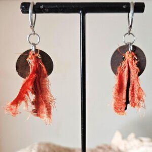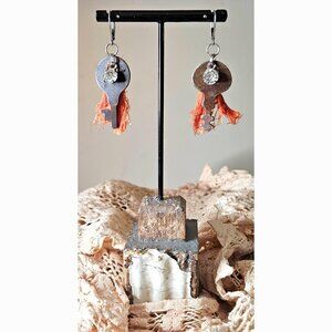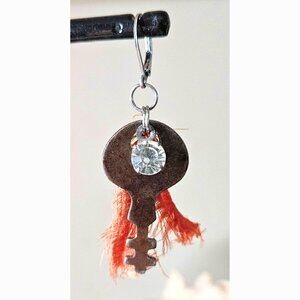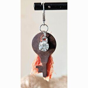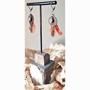 Vintage Rusty Key Earrings Rhinestones Sari Silk Silver Stainless Steel Findings