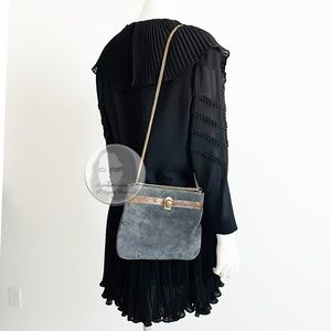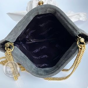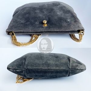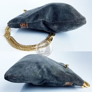 Preowned, vintage Ruth Saltz shoulder bag, likely made in the 80s. Made from steel gray suede, it features a band of tan snakeskin at the front along with a figural cougar head. It features a hinged opening and a chain strap, which can be doubled for hand carry or worn single for shoulder wear. The interior is lined in Ruth Saltz logo fabric with no pockets.