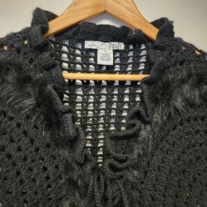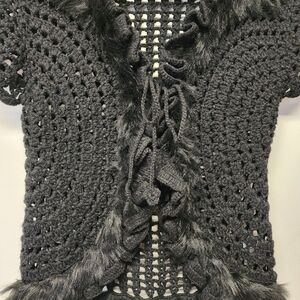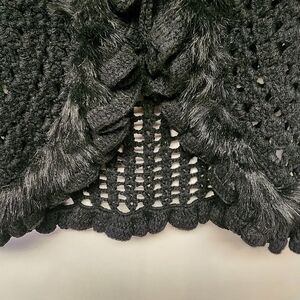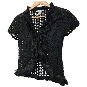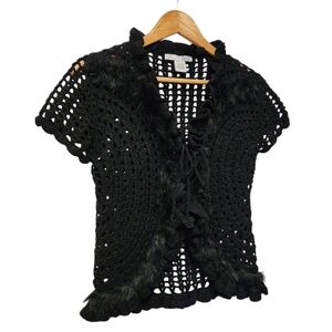 Vintage Rxb Black Crochet Short-Sleeve fur trimmed ruffled Sweater