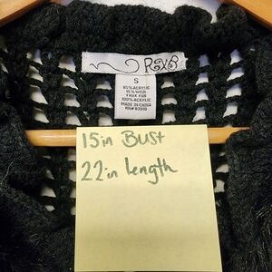 This black Rxb sweater features a crochet open-knit material with a ruffled collar and cap-style short sleeves.