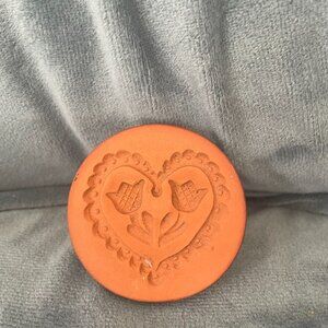 Set of 4 vintage Rycraft porcelain and terra cotta cookie stamps with easy to grip handles. This set has 4 stamps that feature hearts. Each stamp has a unique hand-pressed design, and they are perfect for adding details to cookies and also pretty to display. All stamps are in excellent condition and have been well cared for.