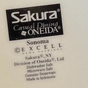 Vintage Sonoma pattern stoneware mug with a wraparound design featuring clusters of golden pears, red apples, and purples grapes framed by lush green leaves against a creamy beige background. White interior and handle. Dishwasher and microwave safe. Measures 3.75 ”tall with a 3.25 ”diameter; 5.25” across including the handle. Holds 12 fluid oz. From Sakura Casual Dining ONEIDA; © EXCELL. Genuine Stoneware. Made in Indonesia.