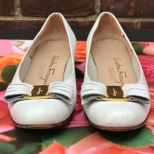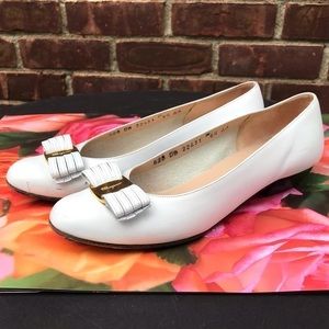 Vintage SALVATORE FERRAGAMO Niccola White Leather Flats bow buckle Size 6.5 AA