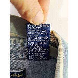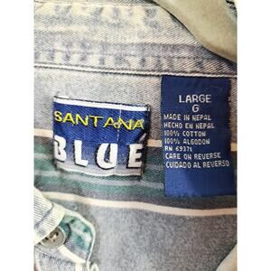 This Vintage SANTANA Denim Shirt is a classic piece with a blue and white striped pattern, perfect for casual occasions in the 80s and 90s. Made of durable cotton denim, this long sleeve button-up shirt features a collared neckline, spread collar style, and regular fit. The shirt has a unique outdoor theme with a touch of nostalgia, making it a standout addition to any wardrobe. With a size large and brand Santana, this shirt is a timeless piece that can be styled for all seasons. This is in used condition with some fading and yellowing around the inside collar. It measures 25" from armpit to armpit and 30" from shoulder to hem.