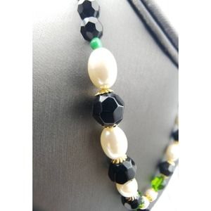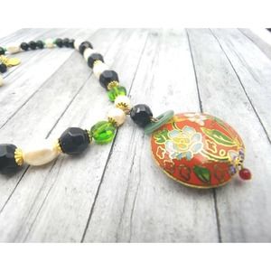 Stunning vintage necklace from Sarah Coventry features an ornate red enamel flower pendant topped by a faux jade disc. Pendant hangs from a combination of smooth and faceted beads: faux pearl, jet, and green with goldtone filigree endcaps.