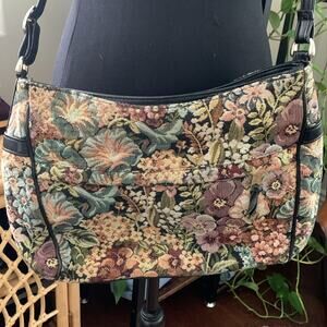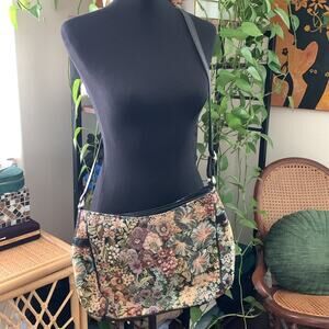 Black with dusty floral tapestry. Adjustable strap. Three separate zippered compartments. Excelled used vintage condition - no rips, tears, or stains. Approximately 9”x13”. Strap drop 20” adjusted in current, longest position.