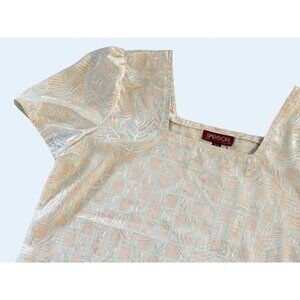 Very pretty vintage top by Sasson. Circa 1980s. Pullover style. Square neck. Peach and blue checkered with silver floral design throughout. Silky feel. 100% polyester. Short puff sleeves. Tag is a size 10/11. Listed as a size small based on measurements (see diagram in photo section). Overall really nice vintage condition!