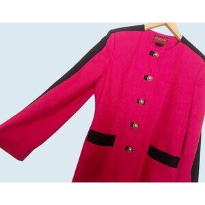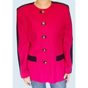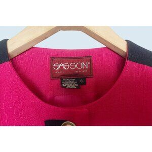 Gorgeous vintage blazer by Sasson. Bright pink with blue stripes down the arms. Full button with oversized button detail. Front pockets. Lined. Tag is a size 8. Listed as a size Small based on measurements (see photos). 65% polyester / 35% rayon. Shoulder pads. Pre-owned in really great vintage condition!