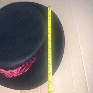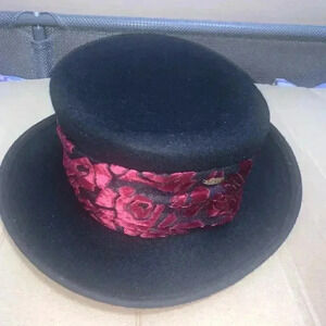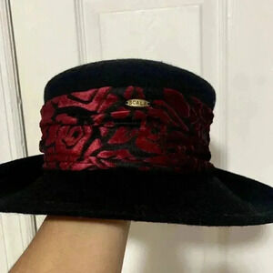 Vintage SCALA 100% wool women's black hat, rose bandana style around the hat.