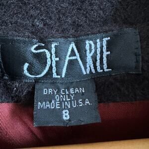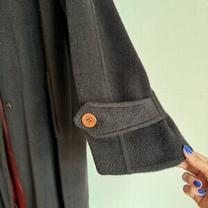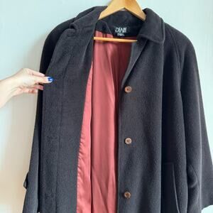 Details: Beautiful longline black vintage 1980s SEARLE overcoat with slant pockets, padded structured shoulders, brown buttons, brick-red lining, and raglan style sleeves.