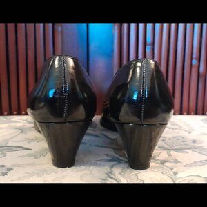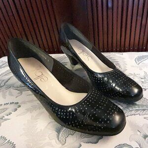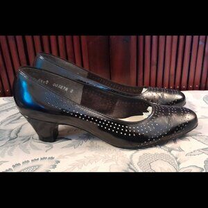 These patent dress pumps have a low heel, and pin dot hole decorative pattern.