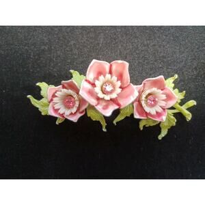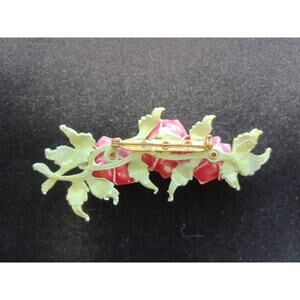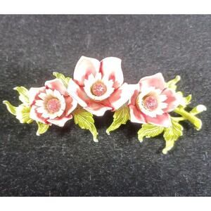 Vintage SELINI Enamel Pink & Rhinestone Flower Trio & Leaves Green Pin Brooch