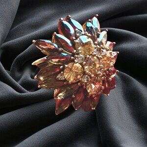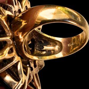 Vintage jewelry lovers—this is your next obsession! This is an absolute showstopper! - a bold 1960s–70s SETA signed cocktail ring in heavy gold vermeil over 925 sterling silver. The oversized floral cluster bursts with natural smoky quartz marquises (deep, mysterious browns), peachy-champagne topaz rounds (that soft glow!), and tiny sparkling single-cut diamonds for extra fire.