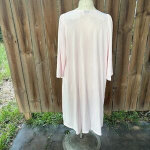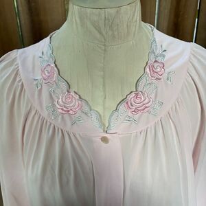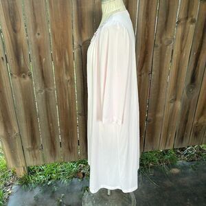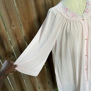 Vintage ShadowLine made in the USA housecoat/robe in light pink with floral embroidery at the neckline, side seam pockets, 3/4 sleeves.