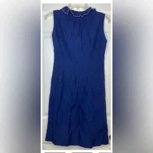 Beautiful dress by SHANNON MCLEAN. navy blue with ruffle around the neck. The ruffle has a white trim. Peek a boo at the right shoulder. No size tag. Seems to be a small. Underarm to underarm measures 18” laid flat. Waist measures 16.5” laid flat. Hips measures 18.5” laid flat. EUC fully lined.