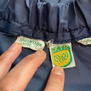 Such an amazing pair of vintage windbreaker pants by SKYR! Full side zipper closure with snap buttons at top. Slight elastic stretch at top. Dark blue. 100% nylon. Made in Hong Kong. Marked size womens large.