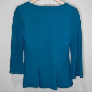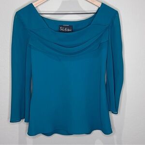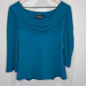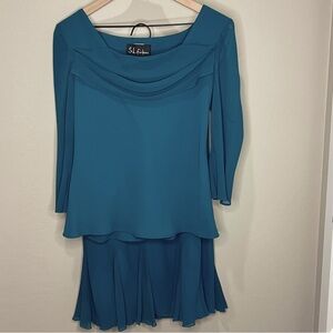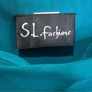 Vintage S.L. Fashions Suit. The size and the care tags have been cut out. Other than that it looks new. It’s a beautiful dress. I’m guessing it’s a smaller size. I posted measurements in pics. It’s an emerald dark green color, more green than pixs show. Skirt has elastic waist and ruffled bottom. Blouse has a beautiful neckline and soft flowy sleeves. Perfect holiday outfit.