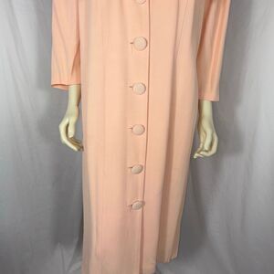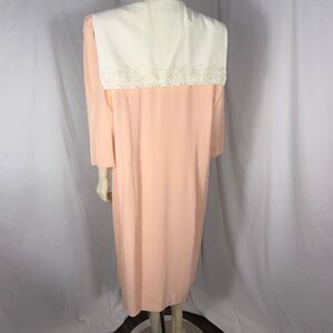 statement collar, lace trim, pastel dress, S.L. Fashions, made in USA, cottagecore, romantic vintage, peach pink dress, button down maxi, retro plus size