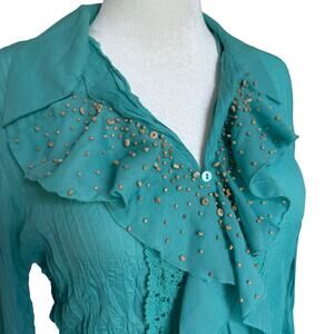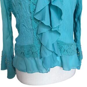Vintage SLB Crinkle Ruffle Beaded Lace Trim Turquoise Top Women's XL Fairycore