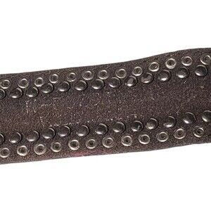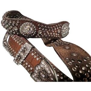 Strut your style with a touch of vintage flair in this Sparkle Leather Rhinestone Concho Belt. The rich brown leather is complemented by shimmering rhinestone accents, offering a blend of elegance and rustic charm. Ideal for those who appreciate a touch of western, cowgirl, or bohemian vibe, this belt measures a generous 45 inches, ensuring a perfect fit for a waist size of more than 39 inches. Crafted with an eye for detail, the belt features a timeless solid pattern and comes with a nickel hardware buckle that adds to its Southwestern-themed allure. Though the brand remains unbranded, the quality and style of this adjustable belt speak volumes, making it a versatile accessory for any wardrobe looking to make a statement. Some wear to the leather, as shown. No missing stones.
