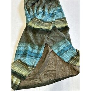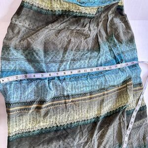 This is a pre-owned women's silk skirt by Spencer Jeremy in size 8. The skirt features a floral print in green, blue, and olive colors with a faux wrap style. It has a high rise and a maxi length. The skirt has a zip closure and is lined. It is recommended to be dry cleaned only. The skirt has an indie, bohemian, 90s, and retro theme and is suitable for all seasons.