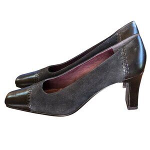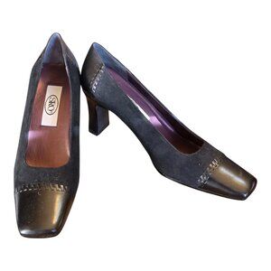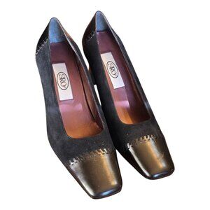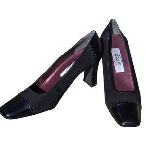 Vintage heels by SRO. These shoes feature a leather & suede upper, block heel and square toe. Very good like new condition. The do have a couple of scuffs as seen in photos.